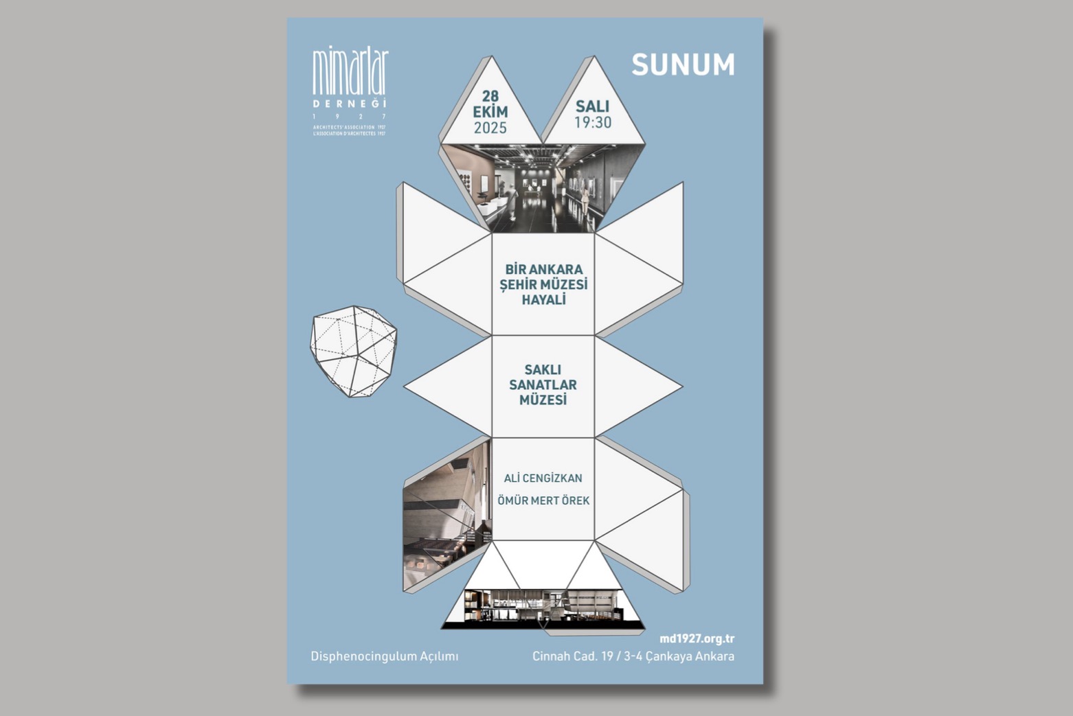 Prof. Dr. Ali Cengizkan (ODTÜ) ve İç Mimar Ömür Mert Örek'in (İD Bilkent Üniversitesi) gerçekleştireceği "Bir Ankara Şehir Müzesi Hayali: Saklı Sanatlar Müzesi” başlıklı sunum 28 Ekim 2025 Salı günü saat 19:30’da Mimarlar Derneği 1927'de gerçekleşecek.