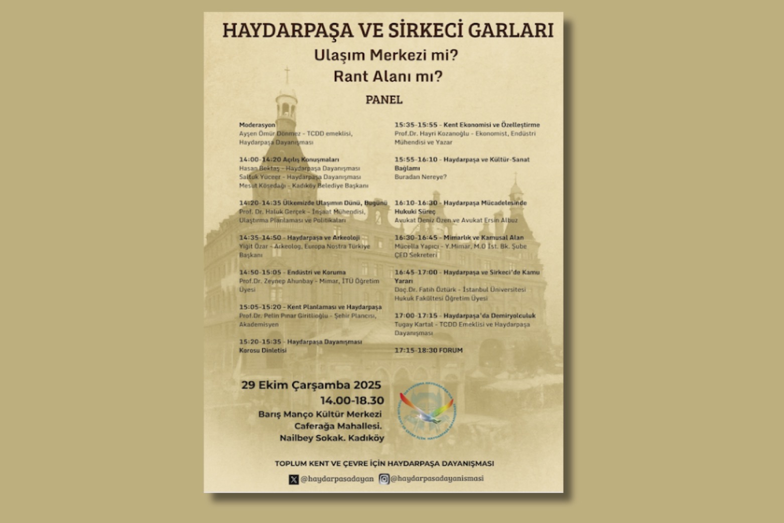 Toplum, Kent ve Çevre İçin Haydarpaşa Dayanışması'nın düzenlediği "Haydarpaşa ve Sirkeci Garları Ulaşım Merkezi mi? Rant Alanı mı?" paneli 29 Ekim Çarşamba günü gerçekleştirilecek.