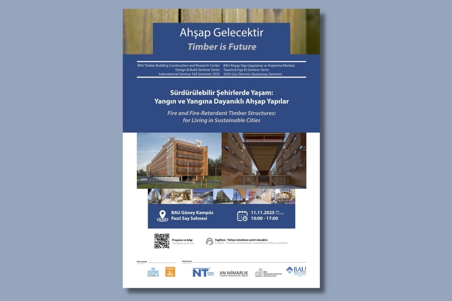 BAU Ahşap Yapı Uygulama ve Araştırma Merkezi, BAU Mimarlık ve Tasarım Fakültesi ve Finlandiya merkezli Nordtreat firması iş birliğiyle düzenlenen bu seminer; ahşabı modern bir yapı malzemesi olarak yeniden keşfetmeye, yenilikçi tasarımı, yangın güvenliğini ve sürdürülebilir inşaatı destekleyen özel çözümleri tanımaya davet ediyor.