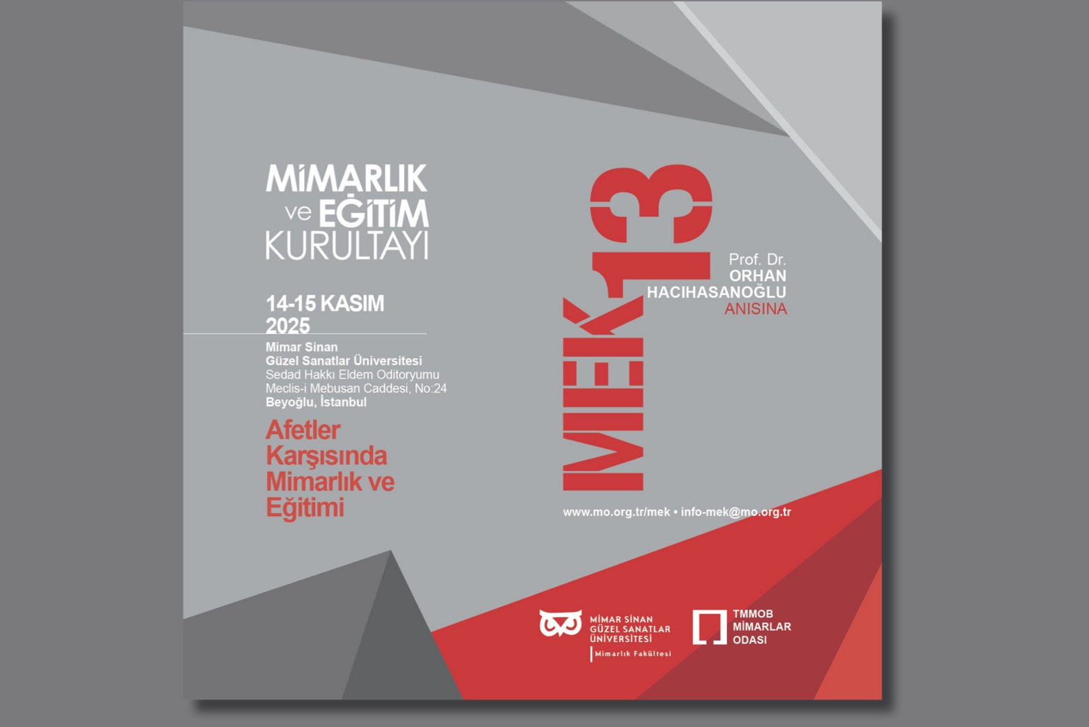 Bu bağlamda, meslek örgütümüzle eğitim kurumlarımızın ortak çalışma ortamında buluşmasını sağlama amacıyla gerçekleştirilen Mimarlık ve Eğitim Kurultaylarının on üçüncüsü "Afetler Karşısında Mimarlık ve Eğitimi" temasıyla 14-15 Kasım 2025 tarihlerinde Mimar Sinan Güzel Sanatlar Üniversitesi’nin ev sahipliğindegerçekleştirilecektir.