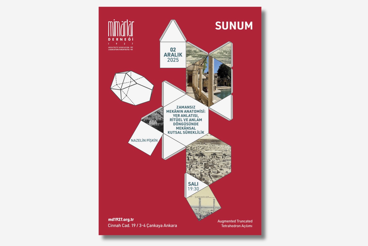 2 Aralık 2025 Salı günü saat 19:30’da Nazelin Pişkin tarafından gerçekleştirilecek olan “Zamansız Mekânın Anatomisi: Yer Anlatısı, Ritüel ve Anlam Döngüsünde Mekânsal Kutsal Süreklilik” başlıklı etkinlik Mimarlar Derneği 1927'de gerçekleştirilecek.