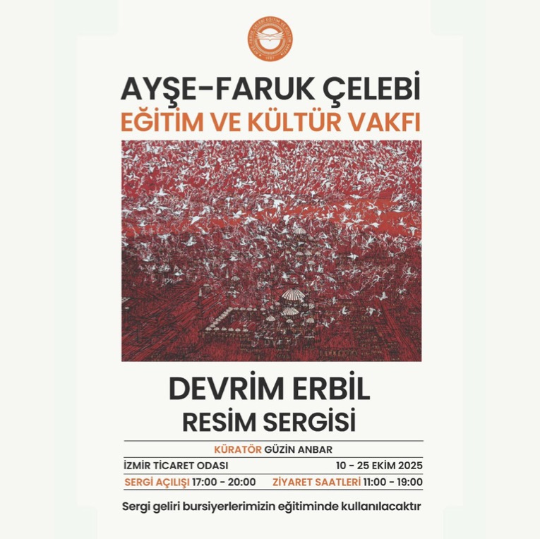 Ayşe Faruk Çelebi Eğitim ve Kültür Vakfı yararına düzenlenen “Devrim Erbil Resim Sergisi”, 10-25 Ekim 2025 tarihleri arasında İzmir Ticaret Odası’nda, Güzin Anbar küratörlüğünde sanatseverle buluşacak.