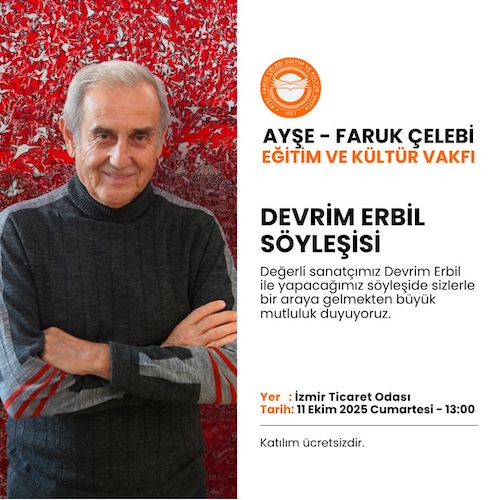 Etkinlik kapsamında Devrim Erbil, 11 Ekim Cumartesi günü saat 13:00’de İzmir Ticaret Odası’nda gerçekleştirilecek özel bir söyleşi ile sanatseverlerle bir araya gelecek. Katılımın ücretsiz olacağı bu buluşmada, sanatçının uzun yıllara dayanan deneyimi, sanata bakışı ve eserlerinin hikayeleri paylaşılacak.