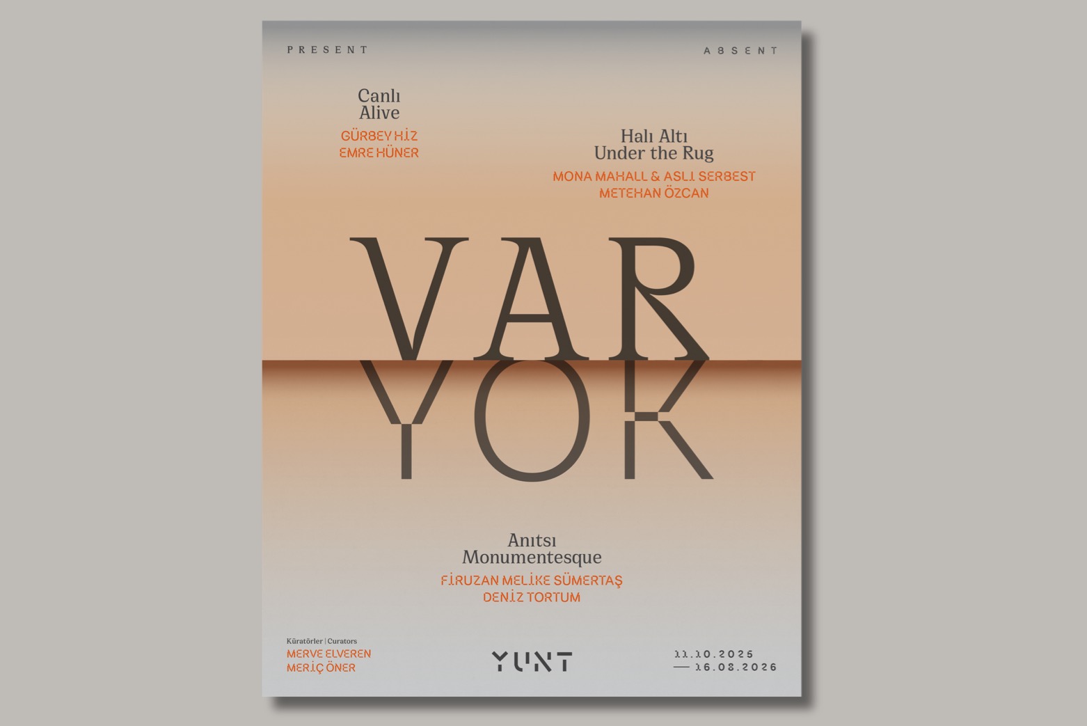 YUNT’un güncel bir kültür kurumunun üstlenmesi gereken sorumluluk ve bilinci açığa çıkarmayı amaçlayan çalışmalarının bir durağı olan “VarYok”, konuşma ve atölye programlarıyla genişliyor. Bir yıla yayılan üç bölüm boyunca üretimler birbirine eklemleniyor; önceki ve sonraki bölümlere göndermeler yapan, nesneleri azalan ya da çoğalan işler sayesinde katılımcılar, sergi süresince YUNT’un soruşturmasına eşlik ederek yeni bir soruyu tartışmaya açıyor: