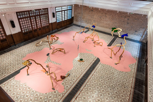 Lungiswa Gqunta, Galata Rum Okulu. "Kaybolanı Bir Araya Getir", 2024-2025, Ahşap, vitray, dikenli tel, kokulu altın otu, değişken boyutlar, sanatçının izniyle. Fotoğraf: Sahir Uğur Eren.