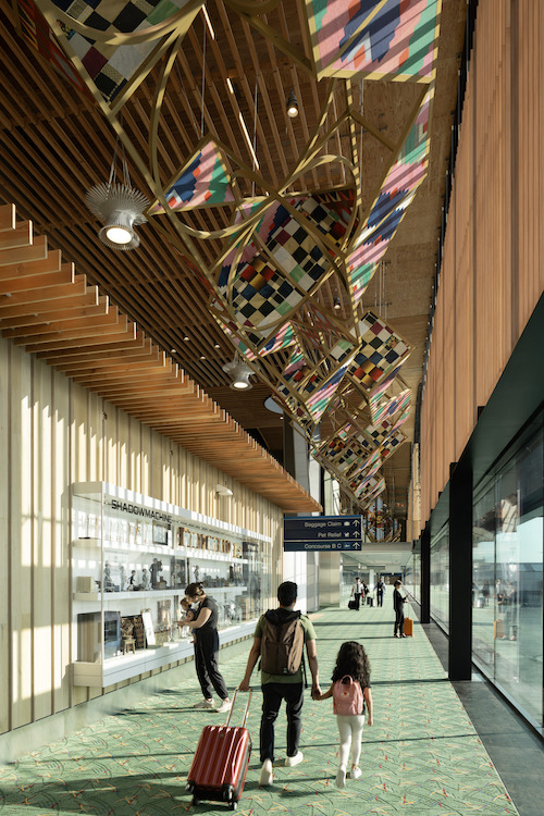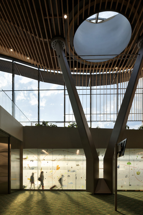Mevcut havalimanına yapısına göre %50 karbon azaltımı gibi iddialı bir hedef, ahşabın yanı sıra çeliğin ve geri kazanılmış malzemelerin kullanımıyla gerçekleştirildi. Yeni bir terminal inşa etmek yerine mevcut terminal yapısını yenileme ve genişletme kararıyla projede önemli ölçüde karbon tasarrufu sağlandı.