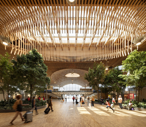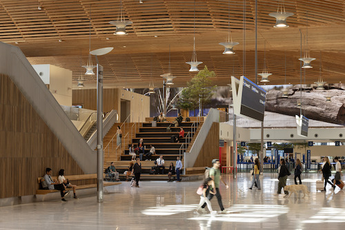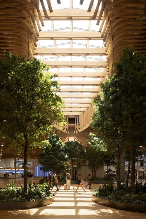 ZGF Architects tarafından tasarlanan, türünün en büyük örneği ve depreme dayanıklı Portland Uluslararası Havalimanı’nın ahşap çatılı ana terminali, ormanda yürüyüşe çıkmış hissini veriyor.