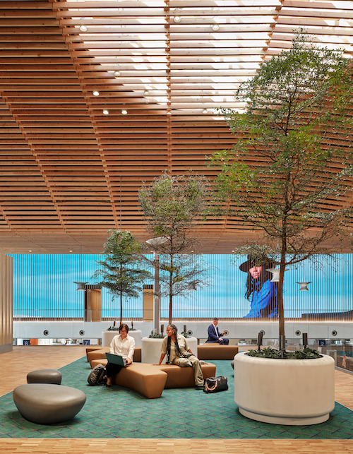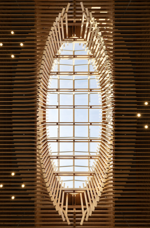 Ziyaretçileri karşılayan etkileyici ahşap çatı, aynı zamanda eyaletin orman ürünleri konusundaki yenilikçi tarihini de simgeliyor. Çatının yapımı için kullanılan yerel ahşap, 970 km yarıçapındaki bir alana yayılmış olan arazi sahiplerinden ve kereste fabrikalarından temin edildi. Masif ve lamine ahşaptan oluşan yaklaşık 8.200 ton ağrılığındaki ve 35.000 m2 büyüklüğündeki dalgalı formlu çatıyı, her birinin ortasında yuvarlak çatı ışıklığı bulunan 34 adet Y şeklindeki kolon taşıyor. Çatının temelini oluşturan ve sürdürülebilir bir şekilde elde edilen yerel ahşap, ait olduğu yere saygı duruşu olarak, temin edildiği kaynak olan ormana kadar takip edilebiliyor. Böylece onun ortaya çıkmasında katkıda bulunan küçük aileler ile Pasifik Kuzeybatı kabileleri (Kızılderili halkları) ve diğer arazi sahipleri de onurlandırılıyor.