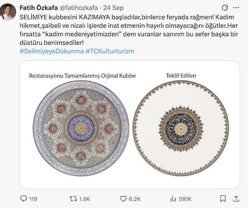 Selimiye Camii’ndeki restorasyon çalışmaları, kamuoyunda büyük tepkiye yol açtı. Cami’nin kubbesindeki tarihi kalem işlerinin kazınarak beyaza boyandığı iddiası üzerine Change.org’da başlatılan imza kampanyası bir günde 5 bine yakın destek topladı.