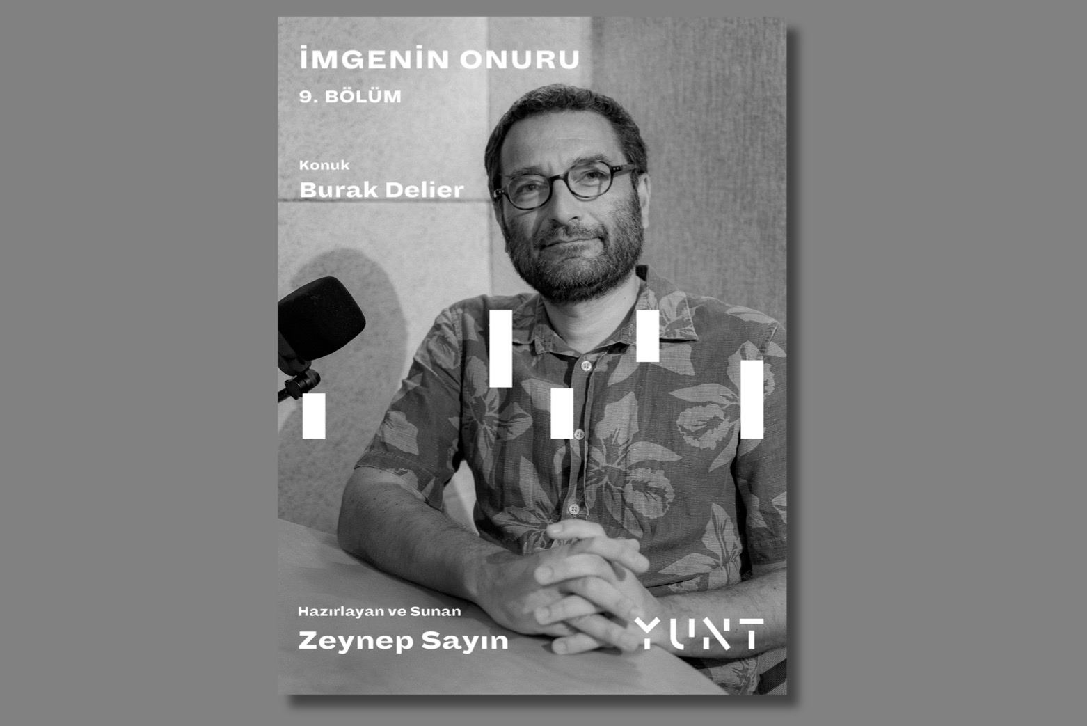 YUNT, yazın bilimci ve sanat kuramcısı Zeynep Sayın tarafından hazırlanıp sunulan “İmgenin Onuru” başlıklı podcast yayınının dokuzuncu bölümünde sanatçı Burak Delier’i konuk etti. Bölüm, Delier’in “Mistik Konferans” başlıklı kitabından hareketle Türkiye’nin yakın tarihinden seslere kulak vererek yaşam, ölüm, felaket, sahtekarlık, teknoloji ve bellek gibi temaları düşünmek için alan açtı.