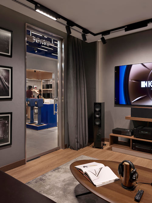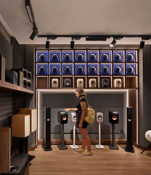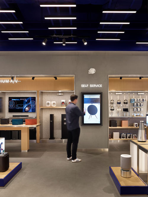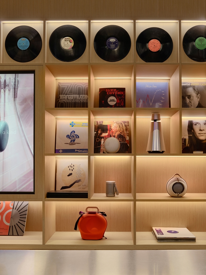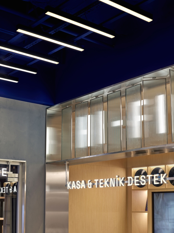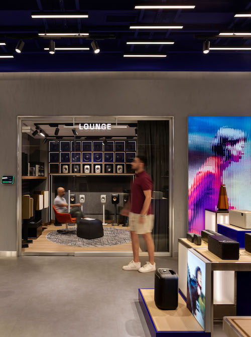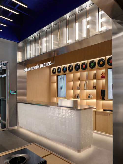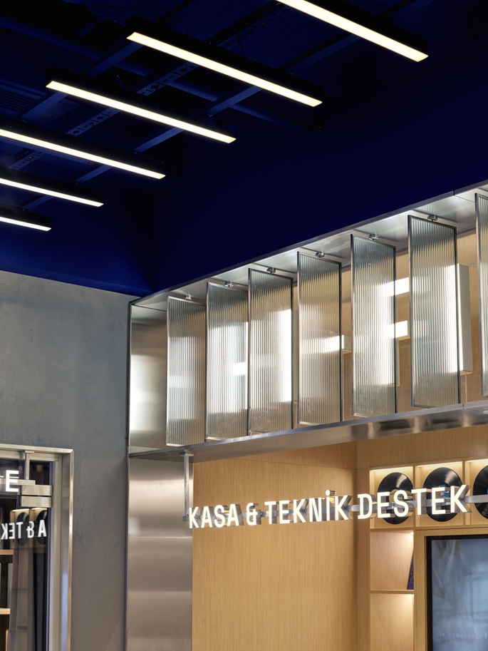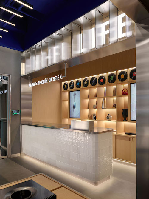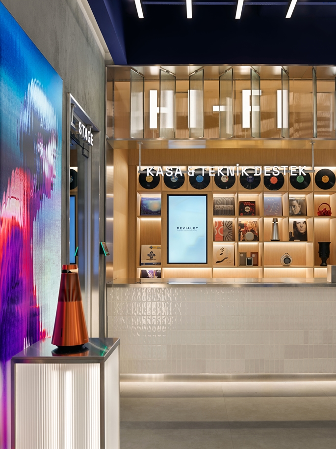 Mekanın merkezi aksında yer alan Hi-Fi Bar, kullanıcı akışının odak noktasını oluşturur. Bu alan, sosyal etkileşim ve birebir ürün deneyimini bir araya getirir. Bar çevresindeki alanlar, kullanıcıya teknolojiyi dokunarak, dinleyerek ve hissederek keşfetme olanağı sunar. Flütlü cam paneller, ışığı kırarak ses dalgalarının titreşimlerini çağrıştıran bir yüzey etkisi yaratır. Mağazanın simgesel ögesi olan Marka Duvarı da bu bölümde yer alır, markanın kimliğini ve enerjisini mekana yansıtan dinamik bir sahne olarak tasarlanmıştır. Gerektiğinde etkinlik veya lansman alanının merkezine dönüşebilen bu alan, mekana süreklilik ve canlılık kazandırır.