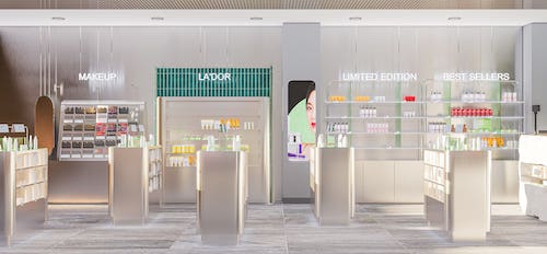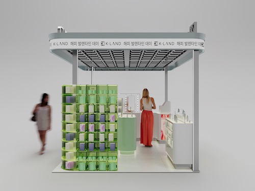 K-LAND için geliştirilen konsept tasarım, markanın çağdaş ve taze kozmetik algısını mekânsal bir dile dönüştürerek iki farklı ölçeği aynı tasarım kimliği altında birleştiriyor: mağaza içi konsept ve AVM kiosk standı.