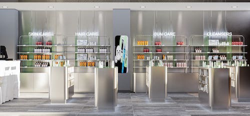 Bu tasarım dilinin AVM kioskuna taşıdığı devamlılık ise marka bütünlüğünü pekiştiriyor. Yeşil tonlu akrilik üniteler, şeffaf yüzeyler ve modüler raf düzeni, kiosk alanına hem doğallık hem de yüksek ürün görünürlüğü kazandırıyor. Tasarımın her iki ayağı da kullanıcıyı deneyim odaklı bir kozmetik ritüeline davet eden modern bir yaklaşım sunuyor.