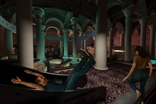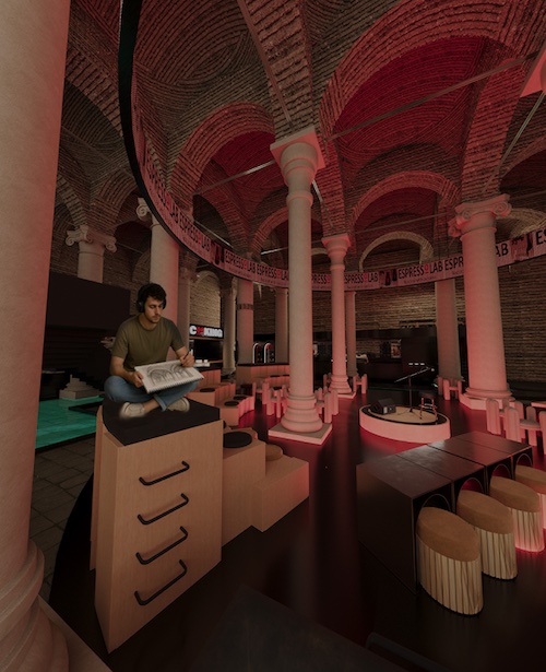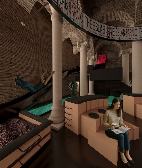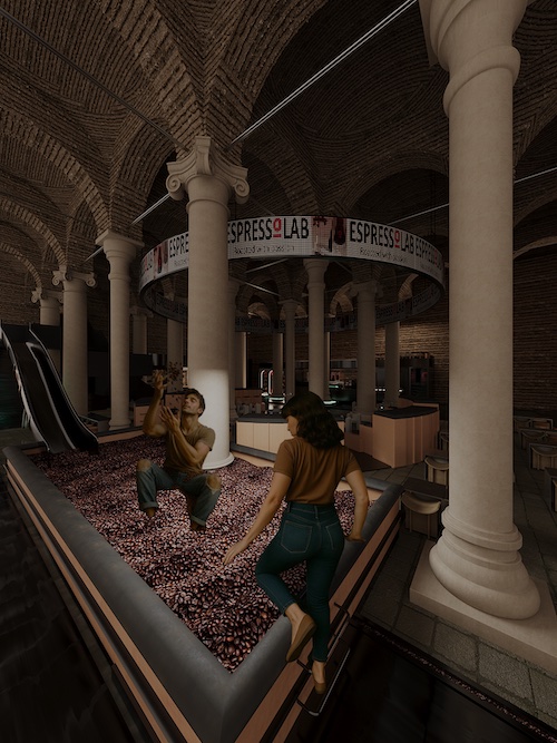 Görsel 8. Sarnıç projesinde kahvenin koku ve tadımdan ziyade dokunsal olarak deneyimlenmesine de dikkat edilmiştir. Giriş kotundan kahve havuzuna inen kaydırak, mekanın durağan atmosferine karşı dinamik bir etki hedeflemiştir.