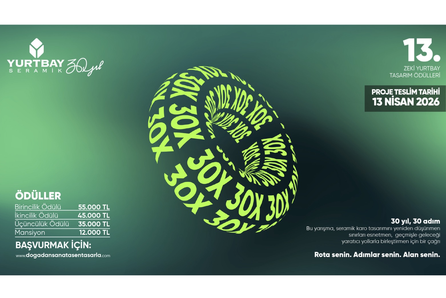Yurtbay Seramik tarafından düzenlenen “Doğadan Sanata Sen Tasarla” Zeki Yurtbay Tasarım Ödülleri, 13. yılında “30X” temasıyla öğrencilerle buluşuyor. Yarışmanın son teslim tarihi 13 Nisan 2026 olarak açıklandı.